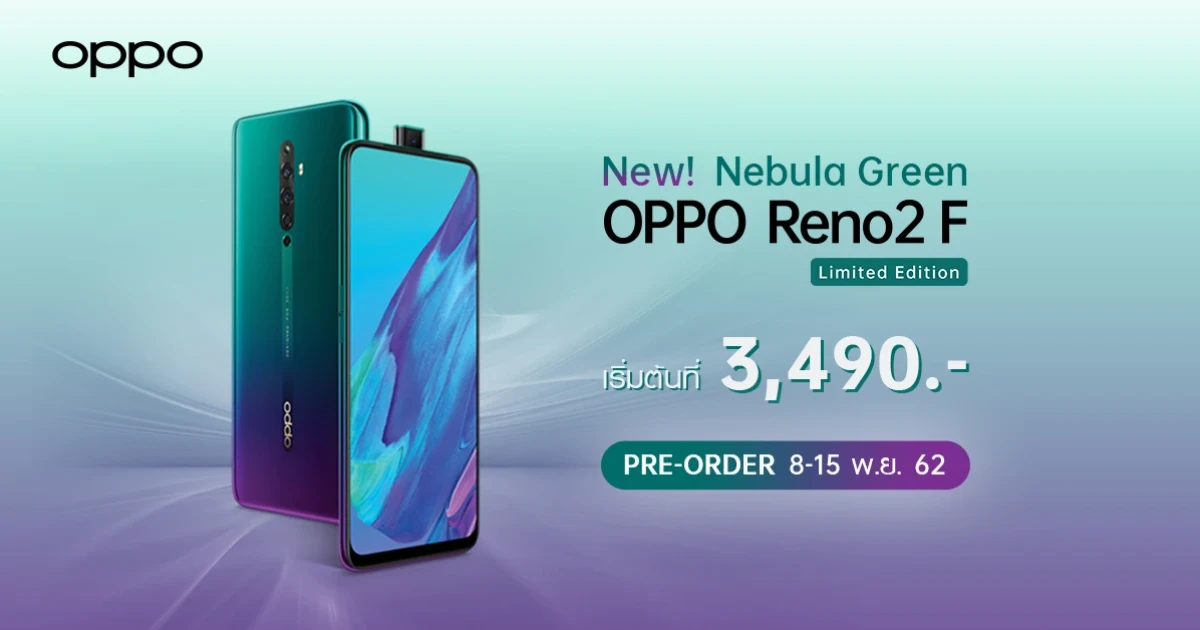 OPPO Reno2 F Nebula Green Limited Edition พร้อมพรีออเดอร์ได้ตั้งแต่วันที่ 8 - 15 พฤศจิกายน นี้ ในราคา 11,990 บาท พร้อมรับฟรี Special gift จาก OPPO มูลค่า 4,799 บาท และพิเศษสุดๆ สำหรับผู้ที่พรีออเดอร์ผ่านผู้ให้บริการเครือข่ายที่ร่วมรายการสามารถเป็นเจ้าของ OPPO Reno2 F Nebula Green Limited Edition ในราคาเริ่มต้นเพียง 3,490 บาท