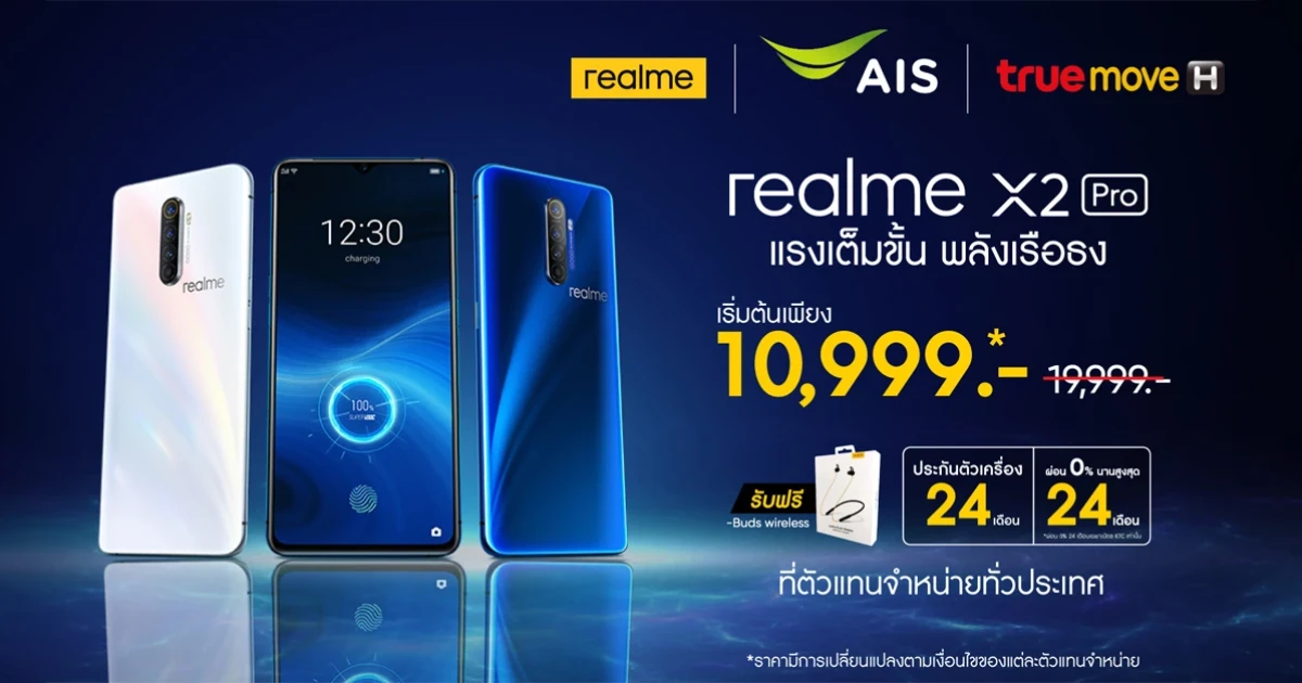 realme X2 Pro สมาร์ทโฟนพลังเรือธงจาก realme ที่เปิดตัวมาสร้างสีสันให้กับวงการสมาร์ทโฟน ล่าสุดวางจำหน่ายอย่างเป็นทางการแล้ว พร้อมกับราคาสุดพิเศษ เริ่มต้นที่ 10,999 บาท จากราคาปกติ 19,999 บาท เท่านั้น! ไม่พอ ยังมาพร้อมกับของแถมสุดพิเศษ realme Buds Wireless หูฟังพลังเสียงแน่น มูลค่า 1,999 บาท พิเศษสำหรับลูกค้าที่ซื้อ realme X2 Pro ตั้งแต่วันนี้ - 31 ธันวาคม รับประกันตัวเครื่องนานถึง 24 เดือน และสามารถผ่อน 0% นานสูงสุด 24 เดือน