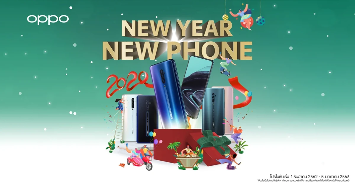 ใกล้ปีใหม่แล้วก็อย่าลืมซื้อสมาร์ทโฟนเป็นรางวัลหรือของขวัญให้แก่คนที่คุณรัก ซึ่งช่วงนี้ถือเป็นโอกาสดีเพราะ OPPO มอบโปรโมชั่นทั้งลดทั้งแถมในช่วงปีใหม่นี้โดยเฉพาะ โดยแคมเปญ "New Year New Phone" นี้ เริ่มตั้งแต่วันที่ 1 ธันวาคม 2562 - 5 มกราคม 2563 ที่ OPPO Brand Shop และตัวแทนจำหน่ายที่ร่วมรายการ