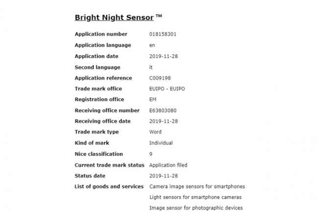 Samsung ยื่นจดสิทธิบัตรเครื่องหมายการค้าในชื่อ "Bright Night" หลังมีเอกสารการยืนจดทะเบียนต่อสำนักงานทรัพย์สินทางปัญญาของสหภาพยุโรป (EUIPO) หลุดออกมา โดยมีรายละเอียดระบุว่า จะใช้ชื่อ Bright Night เป็นชื่อทางการค้าของเซ็นเซอร์กล้องถ่ายรูปตัวใหม่ของซัมซุง ที่คาดว่าน่าจะเป็นเซ็นเซอร์ความละเอียด 108 MP ที่เพิ่งเปิดตัวไปเมื่อไม่นานมานี้ หลังจากมีการระบุในหมายเหตุไว้ว่า จะนำชื่อนี้มาใช้กับเซ็นเซอร์กล้องถ่ายรูปสำหรับสมาร์ทโฟนและแท็บเล็ต