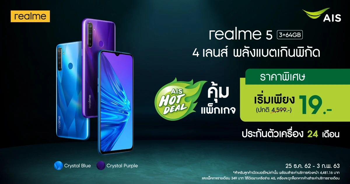 realme ร่วมกับ AIS จัดโปรโมชั่นเด็ด ซื้อ realme 5 ในราคาที่ไม่มีใครกล้าให้ เพียง 19 บาท เพียงสมัครแพ็กเกจสุดคุ้ม และชำระค่าบริการล่วงหน้า โปรโมชั่น 349 บาท ระยะเวลา 12 เดือน (โดยไม่ต้องชำระค่าบริการอินเทอร์เน็ตเพิ่มตลอดระยะเวลา 12 เดือน) ใช้งานอินเทอร์เน็ตได้สูงสุด 30 GB โทรฟรี ในเครือข่าย 24 ชั่วโมง นอกเครือข่ายฟรี 100 นาที! โปรโมชั่นนี้สำหรับ realme 5 ความจุ 3+64 GB ตั้งแต่วันนี้ ถึงวันที่ 3 กุมภาพันธ์ 2563 เท่านั้น