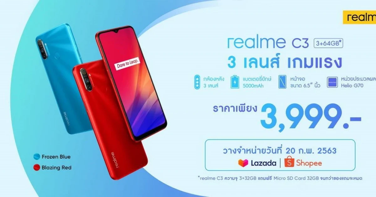 realme C3 มีให้เลือก 2 สี ได้แก่ Blazing Red และ Frozen Blue ความจุ 3GB+32GB พร้อมโปรโมชั่นพิเศษ แถม Micro SD ความจุ 32 GB รวมกันแล้วจะได้พื้นที่ความจุถึง 64GB ในราคาเพียง 3,999 บาท วางจำหน่ายในวันที่ 22 กุมภาพันธ์นี้ ที่ realme Brand Shop และตัวแทนจำหน่ายทั่วประเทศ