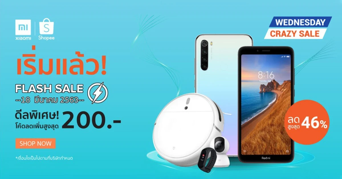 Xiaomi ประเทศไทย จับมือกับ Shopee เอาใจเหล่าสาวก Mi Fans ให้ได้เป็นเจ้าของสินค้าได้ง่าย ๆ กับแคมเปญช้อปปิ้งออนไลน์ "Weekly Wednesday Flash Sales" พร้อมส่วนลดสูงสุดมากถึง 46% เริ่มตั้งแต่เที่ยงคืนของวันที่ 18 มีนาคม 2563 เป็นต้นไป!