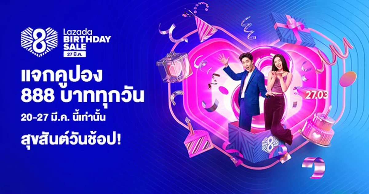 Lazada ฉลองครบรอบ 8 ปีอย่างยิ่งใหญ่ จัดมหกรรมช้อปทะลุโลกวันที่ 27 มีนาคม วันเดียวเท่านั้น พร้อมไฮไลต์จัดหนัก แจกคูปอง 888 บาททุกวัน พบสินค้าลดสูงสุด 90% และ Flash Sale เริ่มต้นเพียง 8 บาท พร้อมช้อปตาแตกตั้งแต่เที่ยงคืนกับสินค้าราคาดีที่สุดในรอบปีจากแบรนด์ดังร่วม 200 แบรนด์ อาทิ Xiaomi, Samsung, Wacoal, Adidas, Bobbi Brown, S-26 และ Whiskas พร้อมพบกิจกรรม Livestream จากดาราวัยรุ่นชื่อดังมากมายที่จะมาร่วมป้ายยาฉลองวันเกิดลาซาด้า ไม่ว่าจะเป็น ออฟ - จุมพล, กัน - อรรถพันธ์, มิว - ศุภศิษฏ์, กลัฟ - คณาวุฒิ, ไบร์ท - วชิรวิชญ์, วิน - เมธวิน, เพิร์ธ - ธนพนธ์, แปลน - รัฐวิทย์ และบลู - พงศ์ทิวัตถ์ ให้นักช้อปฉลองวันเกิดลาซาด้าแบบจุใจ ช้อปฉลองวนไป เหมือนวันเกิดเราเอง!