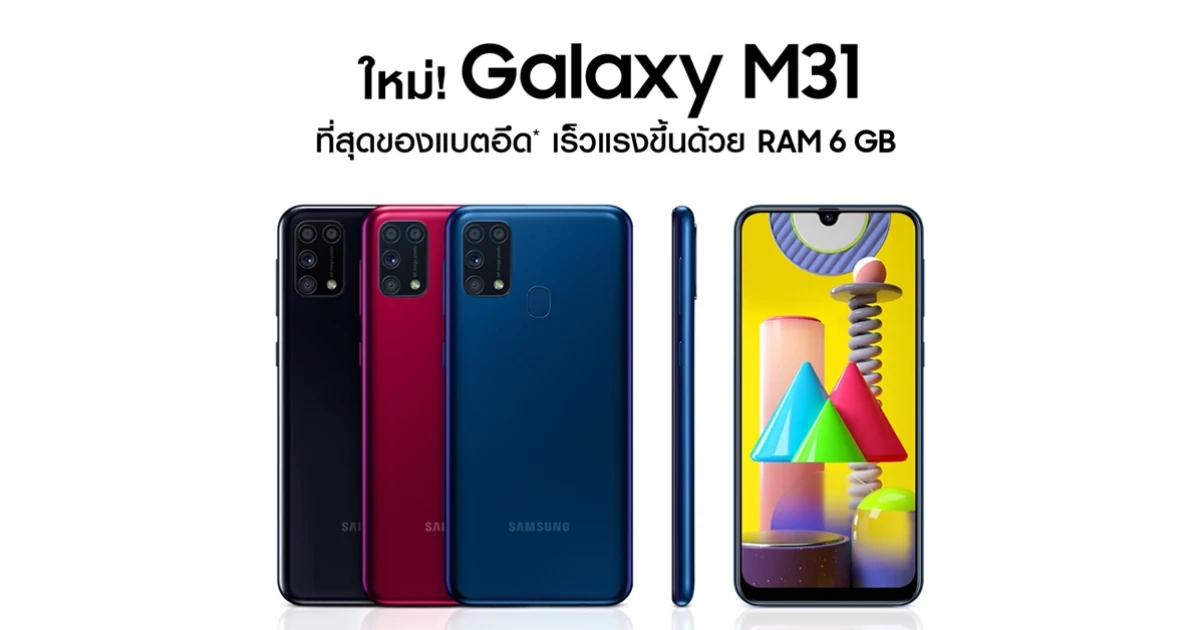 Samsung เปิดตัวสมาร์ทโฟนรุ่นล่าสุด "Galaxy M31" ที่สุดของแบตอึด พร้อมเร็วแรงขึ้นด้วย RAM 6 GB และหน้าจอแบบ Infinity-U กับกล้องสี่ตัวแบบจัดเต็ม พิเศษสุด! สำหรับช่วงพรีออเดอร์ กับราคาพิเศษเพียง 7,590 บาท จากราคาปกติ 8,590 บาท พร้อมรับฟรีลำโพง JBL Go มูลค่า 1,290 บาททันที เมื่อซื้อสินค้าระหว่างวันที่ 20 - 26 มีนาคมนี้ ที่ลาซาด้าเท่านั้น