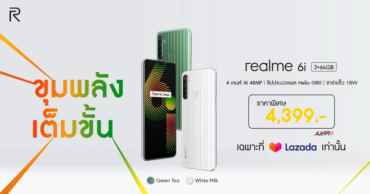 realme 6i มีให้เลือก 2 สี ตั้งชื่อได้น่าทานมากๆครับ ได้แก่สีเขียว Green Tea และสีขาว White Milk ความจุ 3 + 64GB วางจำหน่ายแบบเอ็กซ์คลูซีฟที่ Lazada ในวันที่ 27 มีนาคม พร้อมโปรโมชั่น Flash Sale พิเศษในราคาเพียง 4,399 บาท จากราคาปกติ 4,699 ช่วงเที่ยงคืนเป็นต้นไป