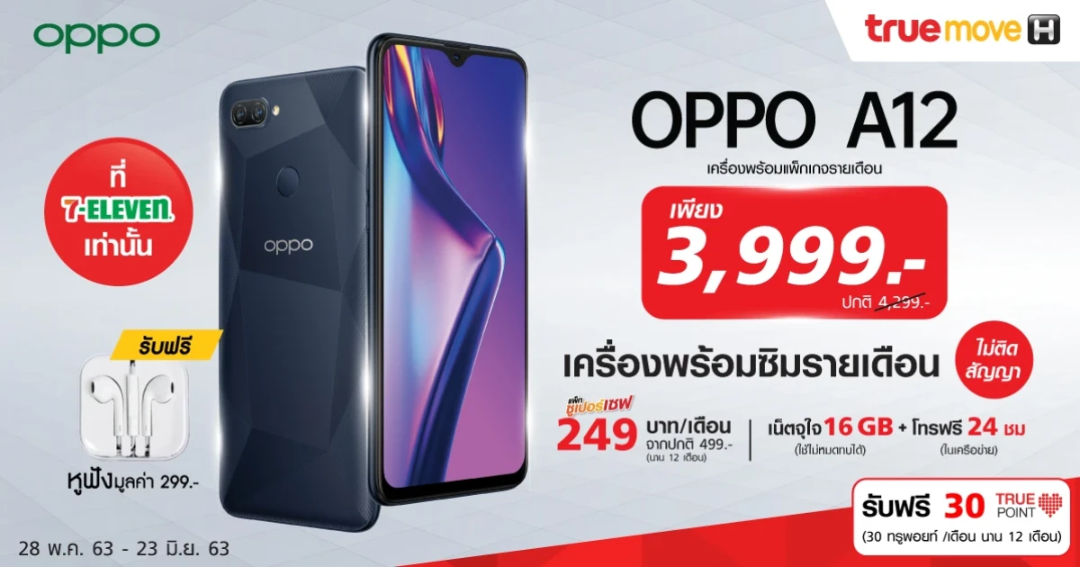 OPPO และ Truemove H จัดโปรโมชั่นสุด Exclusive เมื่อซื้อสมาร์ทโฟน OPPO A12 ในราคาพิเศษเพียง 3,999 บาท จากปกติ 4,299 บาท พร้อมแพ็กเกจรายเดือน เดือนละ 249 บาท จากปกติ 499 บาท โดยไม่ติดสัญญา พร้อมรับสิทธิพิเศษใช้เน็ตได้จุใจ 16GB เมื่อใช้ไม่หมดสามารถทบใช้เดือนถัดไปได้ สิทธิโทรฟรีในเครือข่าย 24 ชั่วโมง พร้อมรับฟรี 30 ทรูพอยท์ทุกเดือน (นาน12 เดือน รวม 360 ทรูพอยท์) และฟรี! หูฟังมูลค่า 299 บาท ระยะเวลาโปรโมชั่นตั้งแต่ 28 พ.ค. - 23 มิ.ย. 63 เฉพาะใน 7-Eleven เท่านั้น