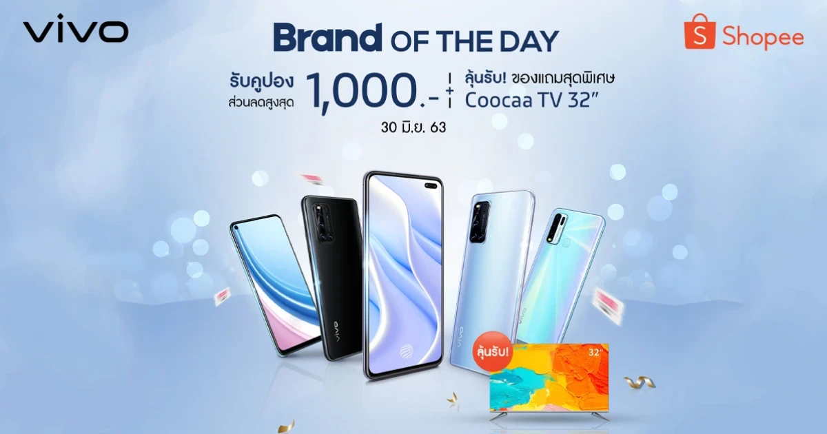เริ่มด้วยของรางวัลใหญ่สุด! COOCAA Smart TV ขนาด 32 นิ้ว มูลค่ากว่า 5,990 บาท สามารถเชื่อมต่อ internet ดู Netflix และ YouTube ได้แบบจุใจ พร้อมฟังก์ชั่นอีกมากมาย รางวัลใหญ่ขนาดนี้ แต่ Vivo ก็ใจปลํ้าแจกมากถึง 30 รางวัล ลุ้นเป็นผู้โชคดีรับรางวัลใหญ่ได้ง่าย ๆ เพียงเข้ามาซื้อของกับ Vivo Thailand Official บน Shopee : shopee.co.th/vivo_thailand