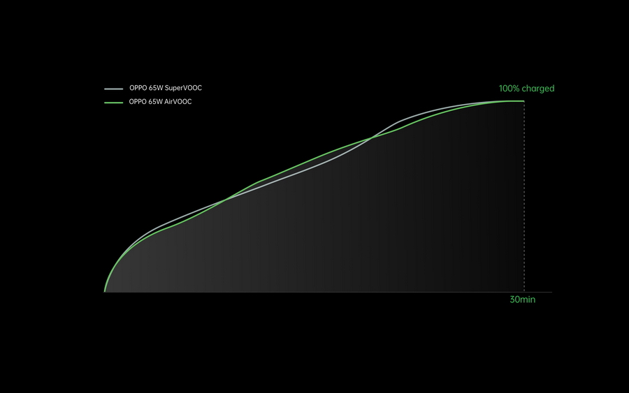 125W Flash charge: การชาร์จที่เร็วและแรงยิ่งกว่าในยุคการเชื่อมต่อ 5G เทคโนโลยี 125W Flash charge ของ OPPO ใช้เทคโนโลยีการชาร์จที่สามารถชาร์จแบตเตอรี่ความจุ 4000mAh ได้สูงถึง 41% ในระยะเวลาเพียง 5 นาที และชาร์จแบตเตอรี่เต็มโดยใช้เวลาเพียง 20 นาทีในอัตราการชาร์จที่เร็วที่สุด ในขณะเดียวกันยังสามารถใช้งานร่วมกับ SuperVOOC และ VOOC flash charge protocols (FCP) รุ่นก่อนหน้านี้ได้อีกด้วย อีกทั้งยังรองรับเทคโนโลยีการชาร์จเร็วที่เป็นโปรโตคอลหลัก ได้แก่ มาตรฐานการจ่ายไฟแบบ 65W PD และมาตรฐานการจ่ายไฟแบบ 125W PPS โดยในปัจจุบันถือว่าเทคโนโลยีการชาร์จเหล่านี้เป็นเทคโนโลยีการชาร์จที่ทันสมัยและก้าวหน้าที่สุดในอุตสาหกรรม การออกแบบในด้านเทคนิคของ SuperVOOC มีวิวัฒนาการจากการอัพเกรดโครงสร้างฮาร์ดแวร์แบบครอบคลุมทั้งหมด ซึ่งสามารถรองรับรูปแบบการชาร์จที่กระแส 20V 6.25A ได้ รวมถึงมีการพัฒนาความหนาแน่นของกำลังไฟฟ้าอย่างมีนัยสำคัญ เพื่อลดระยะเวลาในการชาร์จให้มีประสิทธิภาพโดยที่ไม่จำเป็นต้องเพิ่มขนาดของที่ชาร์จ ทั้งนี้ในส่วนของแบตเตอรี่นั้นถูกบรรจุมาพร้อมกับแบตเตอรี่เซลล์คู่ 6C ที่มีระบบกักเก็บพลังงานแบตเตอรี่ที่ทันสมัย ไม่ว่าจะเป็นด้านโครงสร้างโลหะของแบตเตอรี่ วงจรอัดประจุ และการทำงานประสานกันของ MCU เพื่อพัฒนาประสิทธิภาพของการชาร์จให้ดียิ่งขึ้น