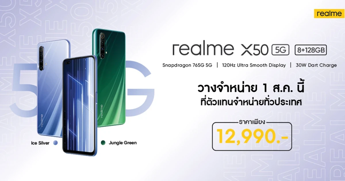 เมื่อเร็วๆ นี้ realme แบรนด์สมาร์ทโฟนเพื่อคนรุ่นใหม่ที่เติบโตเร็วที่สุดในโลก ได้มีการจัดเซอร์ไพรส์เปิดตัวอีกหนึ่งสมาร์ทโฟน 5G อย่าง realme X50 5G ในงานเปิด realme Flagship Store ณ ศูนย์การค้าเซนทรัลเวิลด์ที่ผ่านมา เพื่อตอบโจทย์ไลฟ์สไตล์ผู้ใช้งาน 5G ได้อย่างครอบคลุมยิ่งขึ้น โดย realme X50 5G มาพร้อมชิปเซ็ต Snapdragon 765G 5G หน้าจอขนาด 6.57 นิ้ว ไหลลื่นด้วยอัตรา Refresh Rate 120Hz รองรับเทคโนโลยีชาร์จเร็ว 30W Dart Charge สามารถชาร์จเต็ม 100% ในเวลาเพียง 55 นาที วางจำหน่ายพร้อมกันในวันที่ 1 สิงหาคมนี้ ในราคาเพียง 12,990 บาท ที่ realme Brand Shop และตัวแทนจำหน่ายทั่วประเทศ
