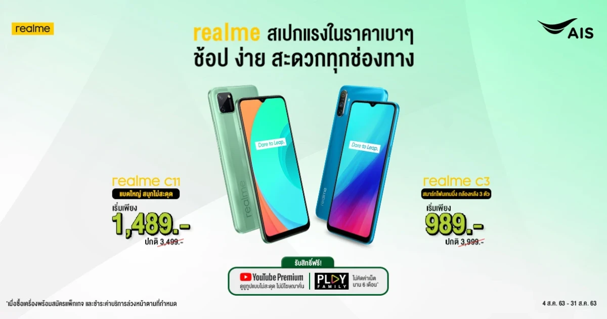 realme แบรนด์สมาร์ทโฟนเพื่อคนรุ่นใหม่ที่เติบโตเร็วที่สุดในโลก พร้อมนำทัพสมาร์ทโฟนสเปคแรงมาจัดโปรโมชั่นพิเศษสำหรับลูกค้า AIS โดยเฉพาะ! นอกจากนี้ พบกับ AIS Hot Deal เพียงลูกค้าเปิดเบอร์ใหม่ เมื่อซื้อ realme C11 หรือ realme C3 รับสิทธิ์รับชม Youtube Premium และ AIS Play Family ฟรี เฉพาะวันนี้ - วันที่ 31 สิงหาคมนี้ ที่ AIS, AIS Shop และ Telewiz เท่านั้น