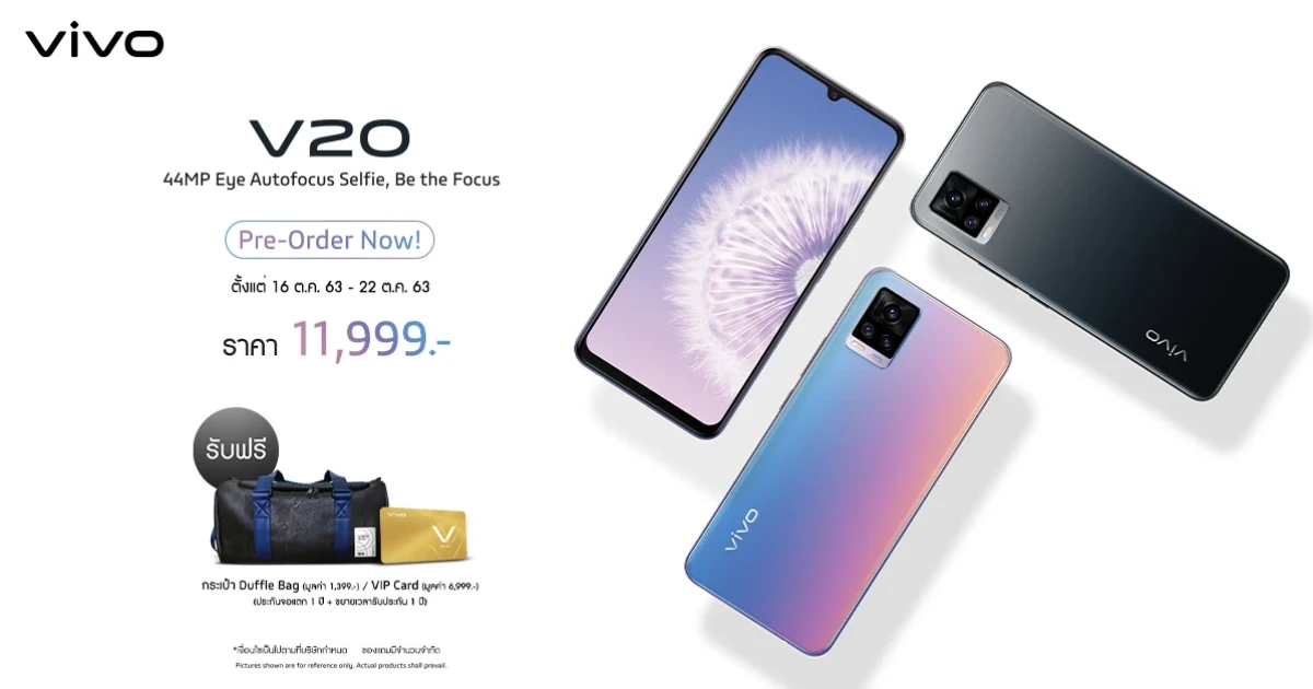 - สำหรับผู้ที่ทำการจอง Vivo V20 สามารถรับเครื่องพร้อมของแถมในวันที่ 23 ตุลาคม 2563 เป็นต้นไป