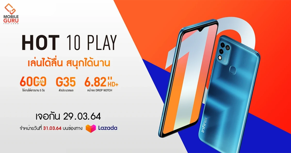 พลาดไม่ได้แล้ว! กับ Infinix HOT 10 PLAY พร้อมเปิดตัวในประเทศไทยวันที่ 29 มีนาคม 2564 ด้วยราคาสุดคุ้มไม่เกิน 4,000 บาท และจะวางจำหน่ายบนลาซาด้าและร้านตัวแทนจำหน่ายทั่วประเทศพร้อมกันในวันที่ 31 มีนาคม 2564 ผู้สนใจค้นหารายละเอียดเพิ่มเติมได้ที่ https://bit.ly/3bT3uAw