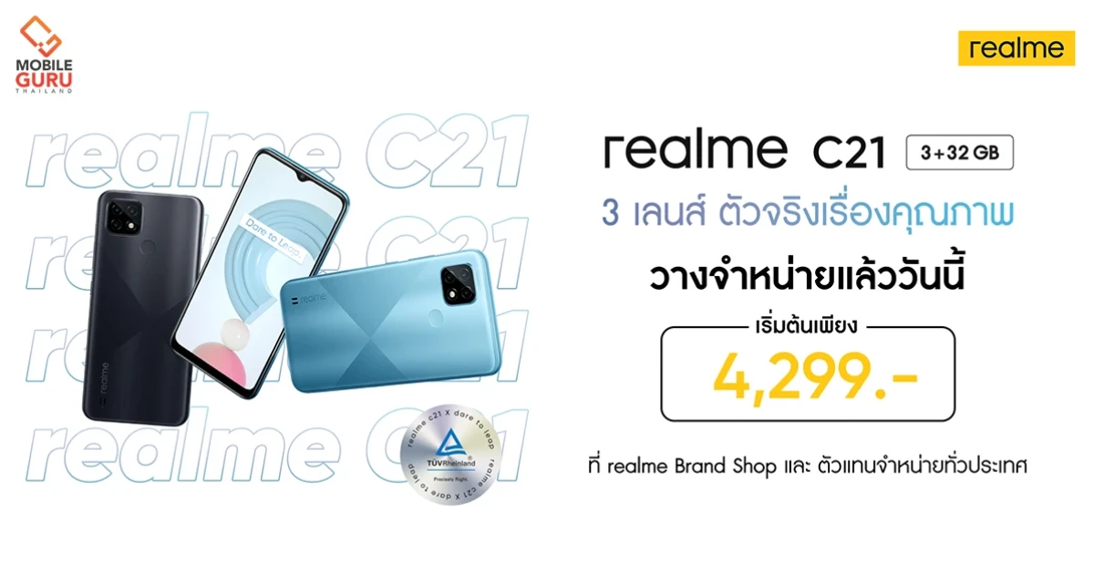 realme แบรนด์สมาร์ทโฟนเพื่อคนรุ่นใหม่ที่เติบโตเร็วที่สุดในโลก วางจำหน่าย realme C21 '3 เลนส์ ตัวจริงเรื่องคุณภาพ' สมาร์ทโฟนที่มาพร้อมกล้องหลัง 3 เลนส์ 13 ล้านพิกเซล การรับรองคุณภาพจาก TUV Rheinland Certified และแบตเตอรี่ 5000 มิลลิแอมป์ ชิปเซ็ต Helio G35 โดยมากับความจุ 3+32 GB ในราคาเพียง 4,299 บาท สามารถเป็นเจ้าของได้แล้ววันนี้ ที่ realme Brand Shop และตัวแทนจำหน่ายทั่วประเทศ
