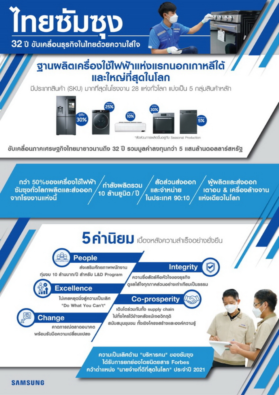 ในฐานะองค์กรใหญ่ ซัมซุงได้ให้การสนับสนุนและช่วยเหลือพาร์ทเนอร์รายย่อยในประเทศอย่างต่อเนื่อง ซึ่งเห็นได้ชัดในช่วงวิกฤติโรคระบาดครั้งนี้ ที่ทางซัมซุงได้เข้าไปดูแลบริษัทคู่ค้าที่ได้รับผลกระทบอย่างเต็มกำลัง ช่วยเสริมกำลังทั้งในเรื่องบุคลากรและกระบวนการผลิต พร้อมให้คำแนะนำด้านการจัดการในสถานการณ์โรคระบาด จึงทำให้ทุกภาคส่วนในระบบห่วงโซ่อุปทานสามารถจับมือเดินหน้าเอาชนะวิกฤติร่วมกันมาได้ ไม่ทิ้งใครไว้ข้างหลัง ตามค่านิยมหลักขององค์กรหรือ “Co-prosperity” ที่ซัมซุงยึดถือมาโดยตลอด ควบคู่ไปกับวัฒนธรรมองค์กรที่มุ่งพัฒนาสู่ความเป็นเลิศอย่างไม่หยุดนิ่ง จึงทำให้ บริษัท ไทยซัมซุง อิเลคโทรนิคส์ แห่งนี้ประสบความสำเร็จอย่างยั่งยืน ขับเคลื่อนธุรกิจเคียงคู่ประเทศไทยด้วยความใส่ใจตลอด 32 ปี