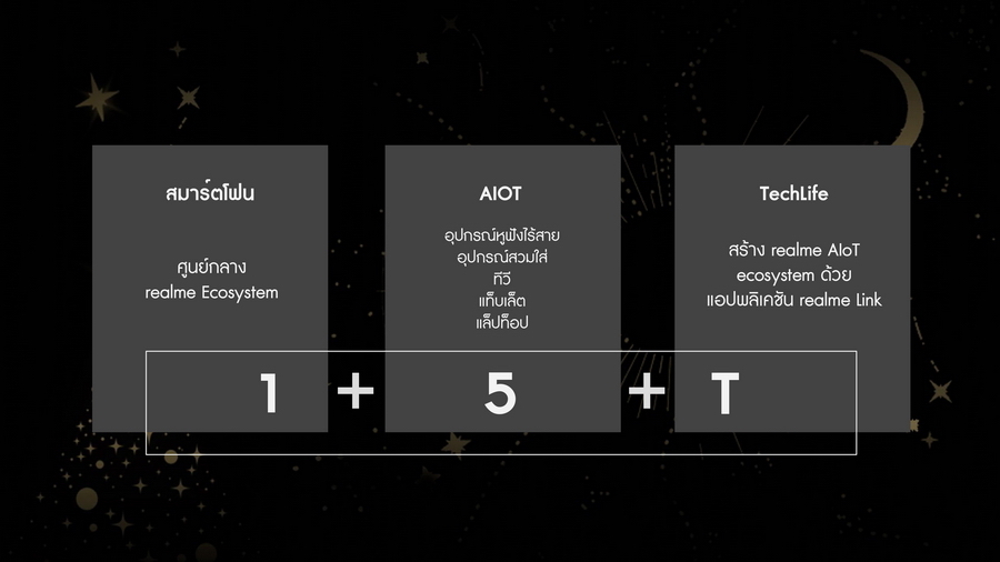 realme จะยังคงเดินหน้าทำตลาด AIOT ตามกลยุทธ์หลักของแบรนด์ นั่นคือ 1+5+T เพื่อมุ่งหวังที่จะสร้าง realme Ecosystem ให้เกิดขึ้นอยู่รอบตัวผู้บริโภค