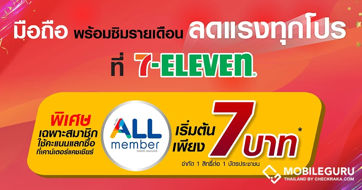 โปรสุดคุ้มรับปีใหม่ ที่จะได้มือถือพร้อมซิมรายเดือน TrueMove H ที่ 7-Eleven ทั่วประเทศ เริ่มต้นเพียง 7 บาท เฉพาะสมาชิก ALL Member ใช้คะแนนแลกซื้อตามเงื่อนไข ที่เคาน์เตอร์แคชเชียร์ได้เลย