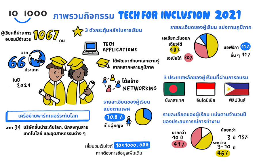 โดยล่าสุดโครงการ “10x1000 Tech for Inclusion (10x1000)” ได้ประกาศความสำเร็จของโครงการในปี 2564 ที่ผ่านมา ด้วยวิสัยทัศน์และเป้าหมายในการฝึกอบรมบุคลากรที่มีความสามารถ และผู้นำด้านเทคโนโลยี 1,000 คนในแต่ละปี เป็นระยะเวลา 10 ปี ในปี 2564 ที่ผ่านมา แพลตฟอร์มดังกล่าวมีผู้เข้าร่วมอบรมจำนวน 1,067 คนจาก 66 ประเทศที่สำเร็จโครงการ Fintech Foundation และ Fintech Leadership Program โดยได้รับประกาศนียบัตรรับรองจาก 10x1000 และ International Finance Corporation (IFC) ซึ่งผู้เรียนเกือบ 80% มาจากเอเชียใต้ และเอเชียตะวันออกเฉียงใต้ โดยมีบังคลาเทศ อินโดนีเซีย และฟิลิปปินส์เป็นสามประเทศแรกที่มีผู้เข้าร่วมมากสุด
