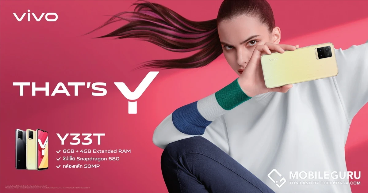 vivo แบรนด์สมาร์ตโฟนชั้นนำระดับโลก เตรียมเปิดตัว Y Series รุ่นล่าสุดของปี 2022 อย่าง vivo Y33T ที่มาพร้อมกับตัวเครื่องดีไซน์ บางเบาเพียง 8.0 มิลลิเมตร หน้าจอโค้งมนจับถนัดมือตามสไตล์ วีโว่ ใช้งานได้ไม่มีสะดุดด้วยชิ ปเซตประมวลผล Snapdragon 680 ที่ช่วยลดการใช้พลังงานได้ดีขึ้ น ทำงานร่วมกับ RAM 8 GB เสริมด้วยเทคโนโลยี Extended RAM ที่ขยาย RAM เพิ่มได้ถึง 4 GB แบตเตอรีความจุ 5000 mAh รองรับเทคโนโลยีชาร์จไว 18W พร้อมระบบการชาร์จย้อนกลับ (Reverse charging) ที่เปลี่ยนสมาร์ตโฟนให้กลายเป็น Power bank ขนาดใหญ่ ขยายระยะเวลาการใช้งานได้จุ ใจกว่าเดิม เก็บรายละเอียดภาพถ่ายคมชัดด้วย กล้องหลักความละเอียด 50MP เตรียมวางจำหน่ายอย่างเป็ นทางการทั่วประเทศ 27 เมษายนนี้ ในราคาเพียง 7,999 บาท