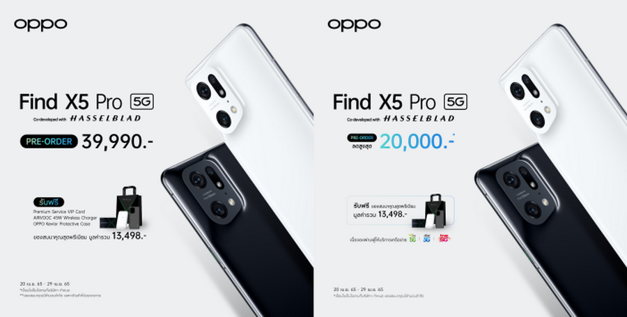 OPPO Find X5 Pro 5G สมาร์ตโฟนแฟลกชิปรุ่นล่าสุดนี้มาใน 2 สี ได้แก่ สีขาว Ceramic White และสีดำ Glaze Black วางจำหน่ายในราคา 39,990 บาท สามารถพรีออเดอร์ได้ตั้งแต่วันนี้ – 29 เมษายน 2565 พร้อมรับของสมนาคุณ Premium Box Set มูลค่า 13,498 บาท ได้แก่ Premium Service VIP Card ประกันหน้าจอแตก มูลค่า 10,000 บาท, AIRVOOC 45W Wireless Charger 2,499 บาท และ OPPO Kevlar Protective Case มูลค่า 999 บาท โดยจะวางจำหน่ายอย่างเป็นทางการตั้งแต่วันที่ 30 เมษายนเป็นต้นไป ณ OPPO Brand Shop ทุกสาขา และตัวแทนจำหน่ายทั่วประเทศ พิเศษ! ให้คุณเป็นเจ้าของ OPPO Find X5 Pro 5G ได้ง่ายยิ่งขึ้นเมื่อจองผ่านผู้ให้บริการเครือข่าย รับส่วนลดสูงสุดถึง 20,000 บาท