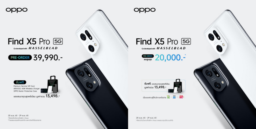 สำหรับ OPPO Find X5 Pro 5G สมาร์ตโฟนแฟลกชิปรุ่นล่าสุดนี้ มาใน 2 สี ได้แก่ สีขาว Ceramic White และสีดำ Glaze Black วางจำหน่ายในราคา 39,990 บาท สามารถพรีออเดอร์ได้ตั้งแต่วันนี้ – 29 เมษายน 2565 พร้อมรับของสมนาคุณ Premium Box Set มูลค่า 13,498 บาท ได้แก่ Premium Service VIP Card ประกันหน้าจอแตก มูลค่า 10,000 บาท, AIRVOOC 45W Wireless Charger 2,499 บาท และ OPPO Kevlar Protective Case มูลค่า 999 บาท โดยจะวางจำหน่ายอย่างเป็นทางการตั้งแต่วันที่ 30 เมษายนเป็นต้นไป ณ OPPO Brand Shop ทุกสาขา และตัวแทนจำหน่ายทั่วประเทศ พิเศษ! ให้คุณเป็นเจ้าของ OPPO Find X5 Pro 5G ได้ง่ายยิ่งขึ้นเมื่อจองผ่านผู้ให้บริการเครือข่าย รับส่วนลดสูงสุดถึง 20,000 บาท