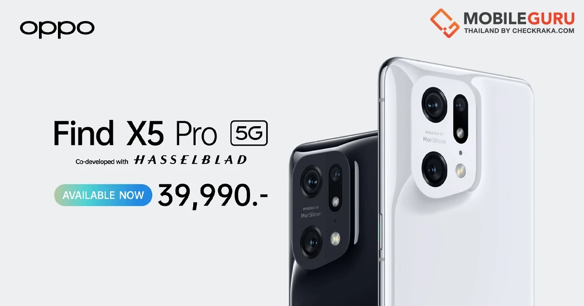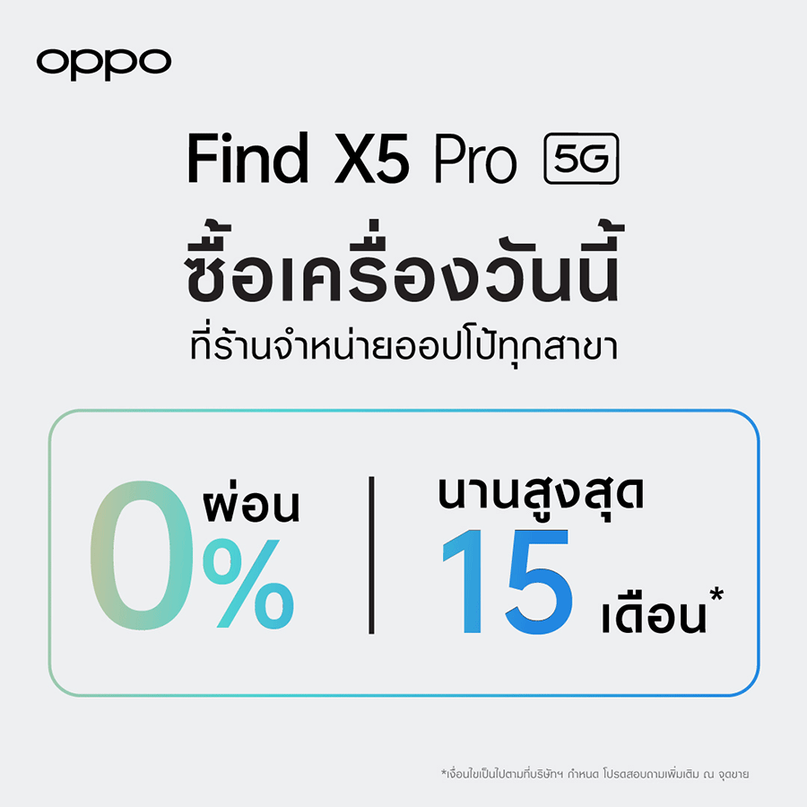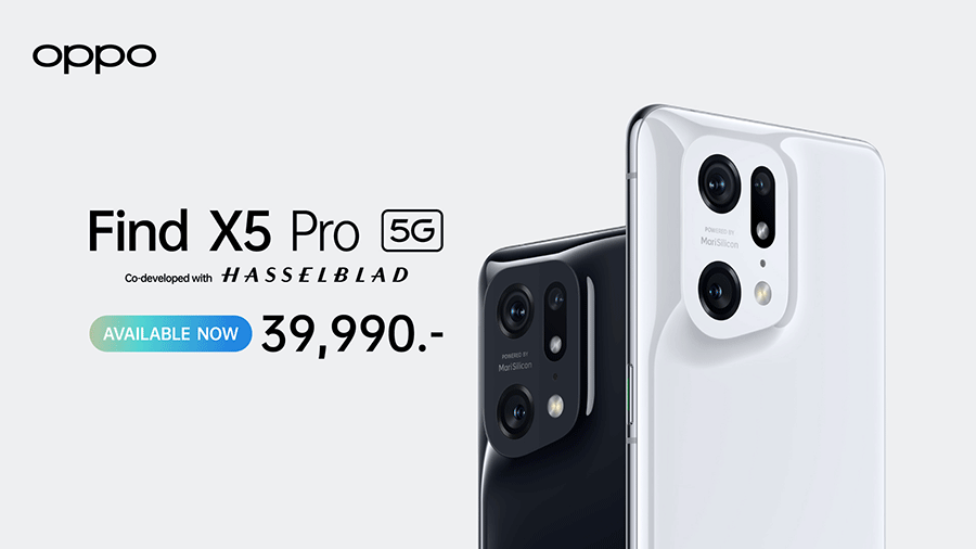 วงการสมาร์ตโฟนคึกคัก หลังออปโป้ได้เปิดตัว OPPO Find X5 Pro 5G สมาร์ตโฟนแฟลกชิปที่ร่วมพัฒนากับ Hasselblad แบรนด์กล้องระดับโลก ในตลาดประเทศไทยไปเมื่อกลางเดือนเมษายนที่ผ่านมา โดยได้รับการกล่าวขานจากทั้งสื่อมวลชนและผู้บริโภคถึงเทคโนโลยีการถ่ายวิดีโอ 4K Ultra Night Video ที่ดีที่สุดและภาพระดับมืออาชีพแม้ในที่แสงน้อยขับเคลื่อนโดย MariSilicon X Imaging NPU จากออปโป้ พร้อมวางจำหน่ายอย่างเป็นทางการแล้ววันนี้ในราคา 39,990 บาท สัมผัสได้แล้วพร้อมกันทั่วไทย ณ OPPO Brand Shop ทุกสาขาและผู้จัดจำหน่ายทั่วประเทศ หรือผ่านผู้ให้บริการเครือข่ายลดสูงสุด 19,000 บาท ตั้งแต่วันนี้ – 31 พฤษภาคม 2565