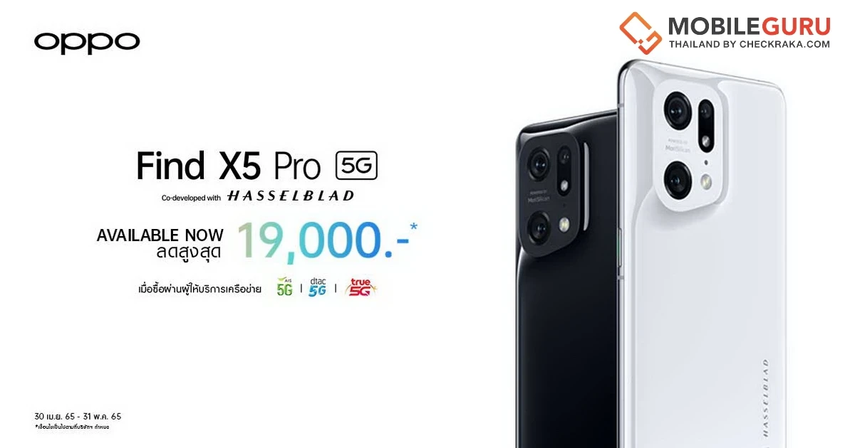 OPPO Find X5 Pro 5G สมาร์ตโฟนแฟลกชิปที่ร่วมพัฒนากับ Hasselblad แบรนด์กล้องระดับโลก สานต่อประสิทธิภาพกล้องระดับตำนาน วางจำหน่ายอย่างเป็นทางการแล้ววันนี้ที่ OPPO Brand Shop ทุกสาขาและผู้จัดจำหน่ายทั่วประเทศ และพิเศษด้วยการจับมือกันระหว่างออปโป้และพันธมิตร AIS, dtac และ TrueMove H ส่งมอบโปรโมชั่นสุดพิเศษ ลดสูงสุดถึง 19,000 บาท