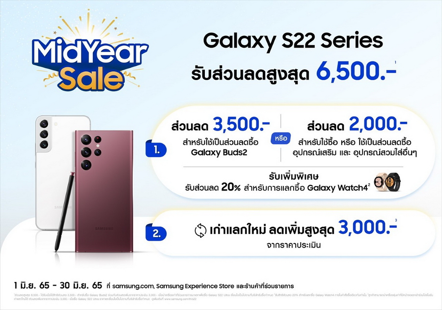 - Galaxy S22 Series สมาร์ทโฟนกล้องคมชัดชนะทุกแสง กับส่วนลดสูงสุดถึง 6,500 บาท โดยรับส่วนลด 3,500 บาท ใช้เป็นส่วนลดซื้อ Galaxy Buds2 หรือ รับส่วนลด 2,000 บาท ใช้ซื้อ หรือ ใช้เป็นส่วนลดซื้อ อุปกรณ์เสริม และ อุปกรณ์สวมใส่อื่น พิเศษ! รับเพิ่มส่วนลด 20% สำหรับการแลกซื้อ Galaxy Watch4 เมื่อซื้อในคำสั่งซื้อเดียวกัน และ รับส่วนลดเพิ่มสูงสุด 3,000 บาท จากราคาเครื่องเก่าปกติ เมื่อนำรุ่นที่ร่วมรายการมาแลก