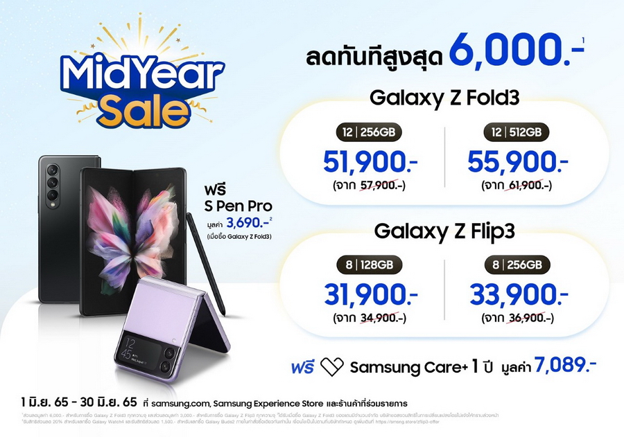 - Galaxy Z Fold3 สมาร์ทโฟนหน้าจอพับได้ตอบโจทย์สายมัลติทาส์ก ลดทันที 6,000 บาท ทุกความจุ เริ่มต้นเพียง 51,900 บาท พร้อมรับ S Pen Pro มูลค่า 3,690 บาทฟรีไปเลยทันที! และ Galaxy Z Flip3 สมาร์ทโฟนที่รวมฟังก์ชันและแฟชั่นมาไว้ในเครื่องเดียว ลดทันที 3,000 บาท ทุกความจุ ในราคาเริ่มต้นเพียง 31,900 บาท โดยผู้ที่ซื้อสมาร์ทโฟนหน้าจอพับได้ทั้งสองรุ่นยังจะได้รับบริการ Samsung Care+ เพื่อการใช้งานอย่างอุ่นใจฟรี 1 ปี มูลค่า 7,089 บาท
