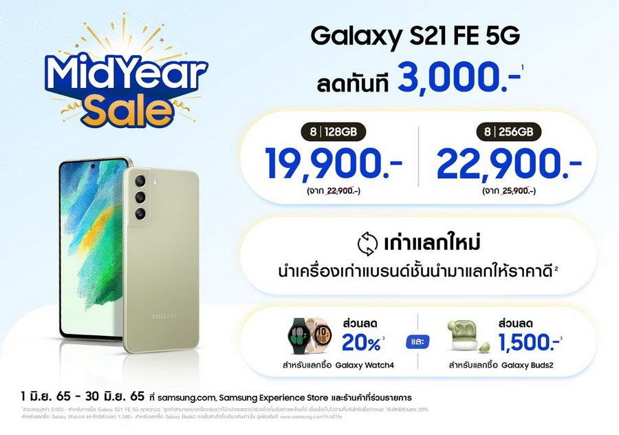 - สำหรับลูกค้าที่ซื้อ Galaxy S21 FE 5G, Galaxy Z Fold3 I Flip3 รับส่วนลด 20% สำหรับการแลกซื้อ Galaxy Watch4 และส่วนลด 1,500 บาท สำหรับแลกซื้อ Galaxy Buds2 ในคำสั่งซื้อเดียวกัน