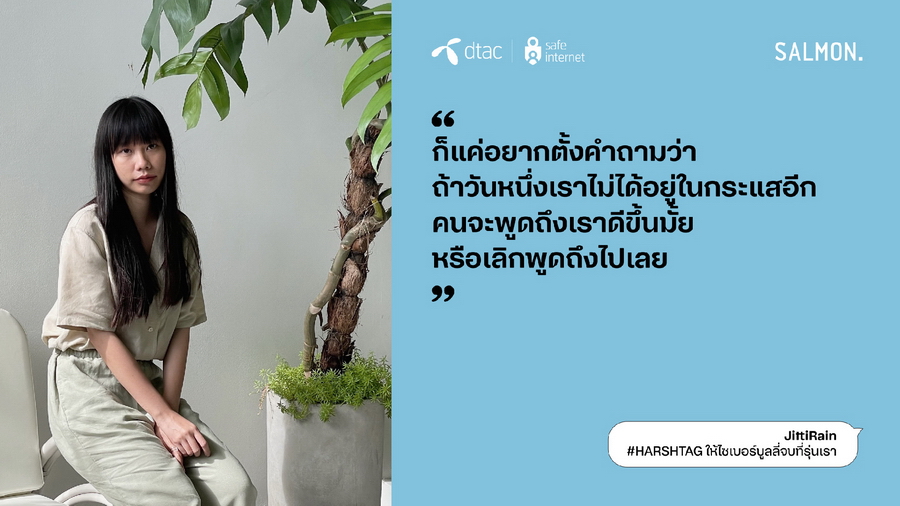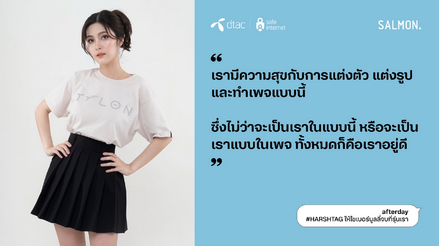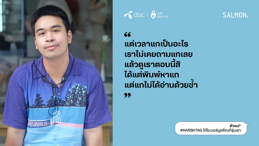 นางอรอุมา ฤกษ์พัฒนาพิพัฒน์ ผู้ อำนวยการอาวุโส สายงานสื่อสารองค์กรและความยั่ งยืน บริษัท โทเทิ่ล แอ็คเซ็ส คอมมูนิเคชั่น จำกัด (มหาชน) หรือดีแทค กล่าวว่า “ดีแทคให้ความสำคัญกับวันต่อต้ านไซเบอร์บูลลี่สากลต่อเนื่ องมาเป็นปีที่ 7 ในปีนี้ ด้วยความตระหนักถึงหน้าที่ ความรับผิดชอบในฐานะบริษัทที่ ให้บริการอินเทอร์เน็ตและบริ การดิจิทัล ต่อความเสี่ยงบนโลกออนไลน์ที่มี ผู้ใช้งานมากกว่า 28% ในไทยเป็นเด็กและเยาวชน โครงการ dtac Safe Internet ยังคงเดินหน้าให้ความรู้สร้างภู มิคุ้มกันบนโลกออนไลน์ และเป็นภาคีสำคัญในการร่ วมหาทางออกและลดความรุนแรงจากภั ยออนไลน์ ซึ่งไซเบอร์บูลลี่เป็นประเด็นปั ญหาในลำดับต้นๆ ที่เยาวชนไทยตระหนักถึงอั นตรายและอยากเข้ามามีส่วนร่ วมในการแก้ปัญหา ในปีนี้ ดีแทคได้ร่วมกับสำนักพิมพ์ แซลมอน หยิบข้อเสนอของเยาวชนใน ‘สัญญาใจวัย Gen Z’ มาถ่ายทอดเป็นเรื่องสั้นที่เปิ ดเผยถึงค่านิยม ทัศนคติ และประสบการณ์ของคนรุ่นใหม่ และสอดแทรกด้วยแนวทางปฏิบัติที่ ใช้ได้จริงทั้ง 23 ข้อ เพื่อหยุดไซเบอร์บูลลี่ ซึ่งรายได้ทั้งหมดจากการจั ดจำหน่ายหนังสือ ดีแทคจะส่งต่อให้สำนักพิมพ์ แซลมอน (Salmon Books) ทั้งหมดโดยไม่หักค่าใช้จ่าย”