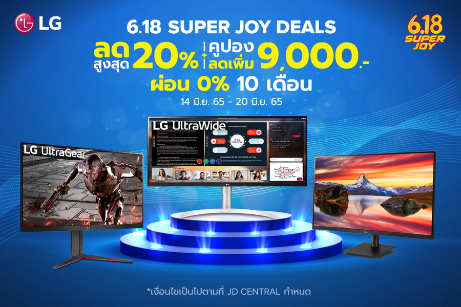 ส่วนไลน์อัพผลิตภัณฑ์จอมอนิ เตอร์ของแอลจี ยังจัดเต็มส่วนลดครบทุกรุ่ นมาให้ช้อปเช่นกัน ไม่ว่าจะเป็นจอมอนิเตอร์ UltraWide จอ IPS จอ LED และจอเกมมิ่งมอนิเตอร์ เอาใจคอเกมชื่นชอบการเล่ นเกมบนจอมอนิเตอร์คุณภาพสูง และผู้ที่ต้องการทำงานบนหน้ าจอขนาดกว้างที่แสดงรายละเอี ยดภาพขั้นสูงเพื่อการทำงานแบบมื ออาชีพ สามารถเลือกช้อปจอมอนิเตอร์ที่ คุณต้องการในราคาสุดพิเศษ เฉพาะโปรโมชั่น “JD 6.18 Super Join Deals” วันที่ 18 - 20 มิถุนายนนี้เท่านั้น