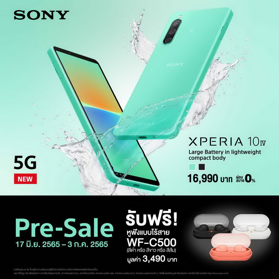 Xperia 10 IV พร้อมเปิดให้ผู้สนใจได้สั่ งจองล่วงหน้าตั้งแต่วันที่ 17 มิถุนายน ถึง 3 กรกฎาคม ศกนี้ โดยมีให้เลือก 2 สีคือสีดำ และสีเขียวมิ้นท์ ในราคา 16,990 บาท พร้อมรับของสมนาคุณเป็นหูฟังตั ดเสียงรบกวนไร้สายรุ่น WF-C500 มูลค่า 3,490 บาท ได้ที่โชว์รูมโซนี่ สโตร์ทุกสาขา ได้แก่ สาขาไอคอนสยาม เซ็นทรัลพระรามเก้า สยามพารากอน เอ็มควอเทียร์ เดอะมอลล์บางแค และเดอะมอลล์บางกะปิ ร้านโซนี่เซ็นเตอร์โดยบูรพวัฒน์ รวมถึงช่องทางออนไลน์ของโซนี่ สโตร์ ผู้สนใจสามารถติดต่อสอบถามข้อมู ลเพิ่มเติมได้ที่ ศูนย์ข้อมูลโซนี่ โทร. 0-2715-6100 หรือเยี่ยมชมเว็บไซต์ www.sony.co.th (การใช้งานบนระบบ 5G ขึ้นอยู่กับความพร้อมของผู้ให้ บริการเครือข่ายช่องสัญญาณ รวมถึงการอัพเดทซอฟต์แวร์ ของเครื่อง)