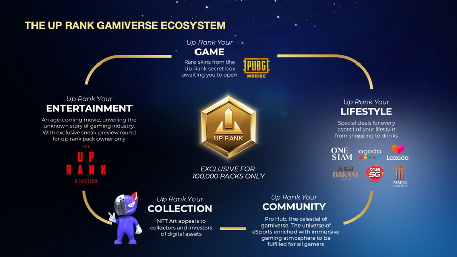 พิเศษไปกว่านั้นกับไฮไลต์ใน “UP RANK GAMIVERSE EXPERIENCE” ได้มีการสร้างสรรค์ NFT Character: UP RANK SCULPTURE ขนาดยักษ์ที่เชื่อมต่อมาคาแร็คเตอร์จากภาพยนตร์เรื่อง THE UP RANK อาชญาเกม ที่มาพร้อมกิจกรรมพิเศษสุดเซอร์ไพรส์ เฉพาะผู้ซื้อ UP RANK PACK ในงานวันที่ 14 กรกฎาคม เท่านั้น ได้ลุ้นเพิ่มกันไปเลย! ของรางวัลสุดพิเศษมากมายที่คุณคาดไม่ถึง!