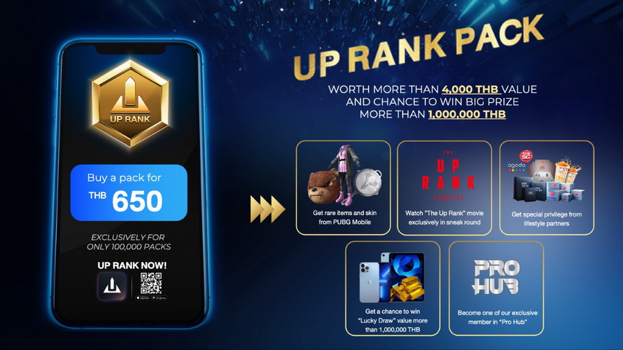 พร้อมพบกับอีกหนึ่งไฮไลต์กับการเปิดตัว UP RANK PACK แพ็กแรกและแพ็กเดียวของโลกที่อัพ 1,000,000 ให้ชีวิตเกมเมอร์เป็น MVP ด้วยราคาสุดคุ้ม 650 บาท แต่สิ่งที่ได้กลับมาคือสิทธิประโยชน์มากมายไม่ว่าจะเป็น Limited Edition Skin Items จากเกม PUB G Mobile ซึ่งการันตีได้ว่าสุดเทพ! และไม่สามารถหาได้จากที่อื่น ซึ่งมีมาให้ร่วมลุ้นถึง 16 ไอเท็มด้วยกัน อาทิ Skin Angry Teddy, Pretty in Pink, Runner's Set, Golden Eagle เป็นต้น รวมถึงสิทธิพิเศษในการชมภาพยนตร์ ‘The Up Rank อาชญาเกม’ภาพยนตร์เผยเรื่องราวการปั๊มแรงค์ในวงการเกมยุคปัจจุบัน แบบเอ็กซ์คลูซีฟพรีเมียร์ก่อนใคร 100,000 ที่นั่งพร้อมกันทั่วประเทศ! ในวันที่ 4 สิงหาคมนี้