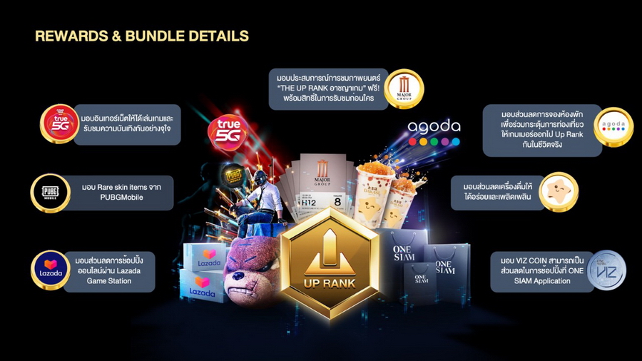 นอกจากนี้ UP RANK PACK ยังอัพไลฟ์สไตล์ของคนที่ซื้อ กับสิทธิพิเศษจากพาร์ทเนอร์ชั้นนำระดับประเทศ ไม่ว่าจะเป็น Siam Piwat (สยามพิวรรธน์), ทรู 5g (True5g), อโกด้า (Agoda), ลาซาด้า (Lazada) และดาคาซี่ (Dakasi) จนถึงสิ้นปี ซึ่งในงาน “UP RANK GAMIVERSE EXPERIENCE” เหล่าพันธมิตรชั้นนำได้ยกขบวนมามอบประสบการณ์ด้านไลฟ์สไตล์ให้กับผู้เข้าร่วมงานเช่นกัน นอกจากนี้ผู้ซื้อ UP RANK PACK ยังมีสิทธิ์ลุ้นรางวัล Lucky Draw แรงค์ใหญ่ตลอดระยะเวลากว่า 4 สัปดาห์ตั้งแต่ 14 ก.ค. 2565 – 10 ส.ค. 2565 รวมมูลค่ากว่า 1,000,000 บาท** อาทิ ทองคำแท่ง น้ำหนัก 10 บาท จำนวน 3 แท่ง, หน้าจอ Samsung Curve 49 นิ้ว , iPhone 13 Pro Max/ iPad Air5, AirPod3 เป็นต้น โดยจำหน่ายในจำกัดจำนวน 100,000 แพ็กเท่านั้น!