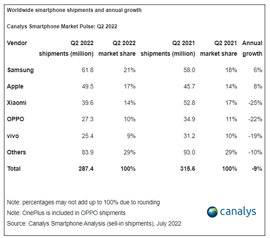 Canalys รายงานว่าในช่วงไตรมาสที่ 2 ของปี 2022 ที่ผ่านมา มีการจัดส่งสมาร์ตโฟนทั่วโลกทั้งหมด 287 ล้านเครื่อง ซึ่งเป็นตัวเลขที่ลดลงจากปีที่แล้วเมื่อเปรียบเทียบแบบรายปี (YoY) อยู่ประมาณ 9% โดย SAMSUNG ยังคงเป็นเบอร์ 1 ของโลกด้วยยอดจัดส่งสมาร์ตโฟน 61.8 ล้านเครื่อง มีส่วนแบ่งทางการตลาดอยู่ที่ 21% ลดลงจากไตรมาสก่อนอยู่ 16% แต่เมื่อเทียบกับปีก่อนในช่วงเวลาเดียวกันมียอดจัดส่งเพิ่มขึ้น 6% ต่อปี โดยสมาร์ตโฟนที่เป็นพระเอกทำยอดให้กับซัมซุงคือ Samsung Galaxy A Series