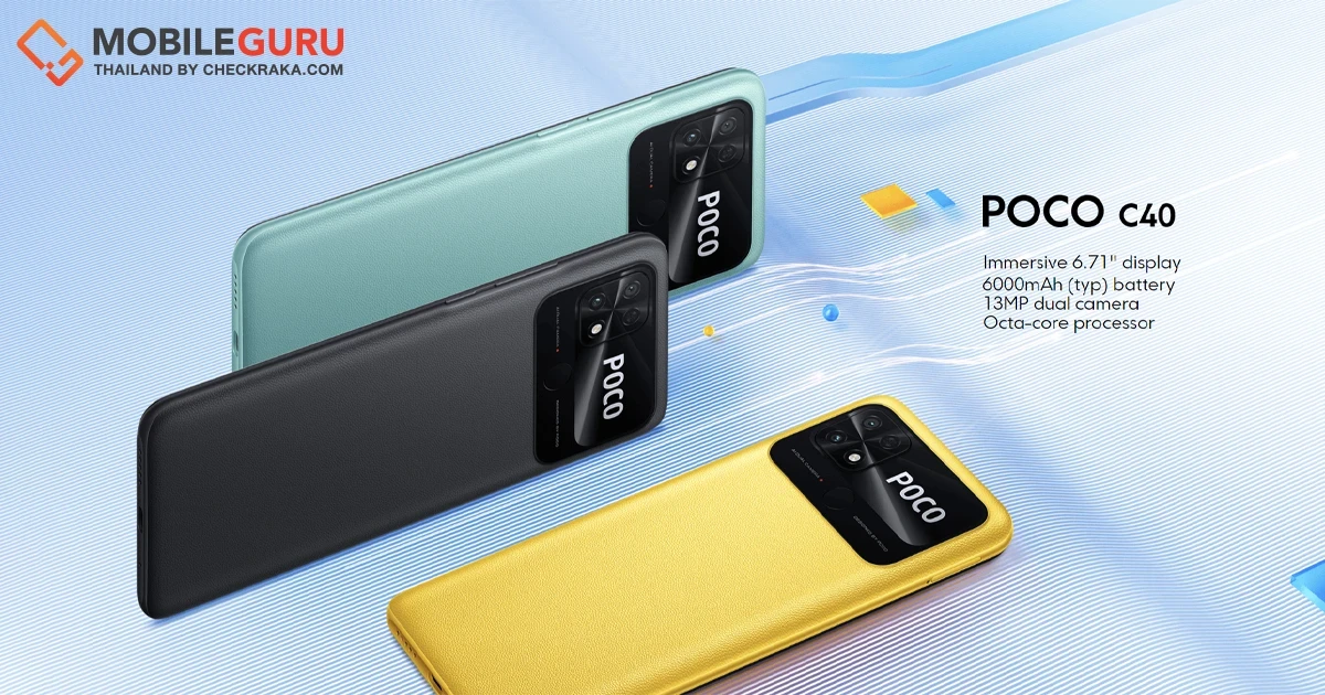 POCO C40 มีให้เลือก 3 สี ได้แก่ POCO Yellow, Power Black และ Coral Green โดยจะวางจำหน่ายในประเทศไทยด้วยรุ่นความจุ 3GB + 32GB ในราคาเพียง 3,499 บาท!