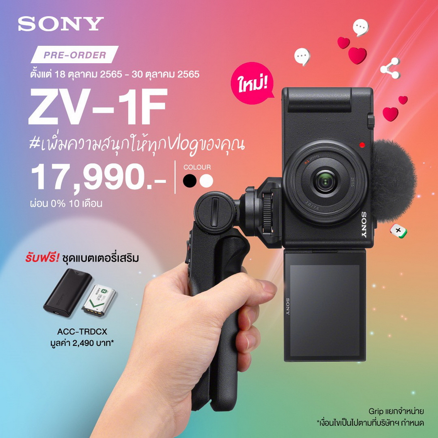 กล้อง ZV-1F มีให้เลือก 2 สี คือสีขาว และสีดำ พร้อมเปิดให้ผู้สนใจสั่งจองได้ระหว่างวันที่ 18 ถึง 30 ตุลาคม 2565 ในราคา 17,990 บาท พิเศษ !! สำหรับลูกค้าที่สั่งจอง ZV-1F รับฟรี ชุดแบตเตอรี่เสริมรุ่น ACC-TRDCX มูลค่า 2,490 บาท โดยสามารถ สั่งจองได้ที่ โชว์รูมโซนี่สโตร์ทุกสาขา โซนี่สโตร์ออนไลน์ และร้านตัวแทนจำหน่ายทั่วประเทศ กล้อง ZV-1F จะเริ่มวางจำหน่ายอย่างเป็นทางการตั้งแต่กลางเดือนพฤศจิกายน ศกนี้ เป็นต้นไป ผู้สนใจสามารถสอบถามข้อมูลผลิตภัณฑ์เพิ่มเติมได้ที่ ศูนย์ข้อมูลโซนี่ โทร. 0-2715-6100 หรือเยี่ยมชมได้ที่ www.sony.co.th