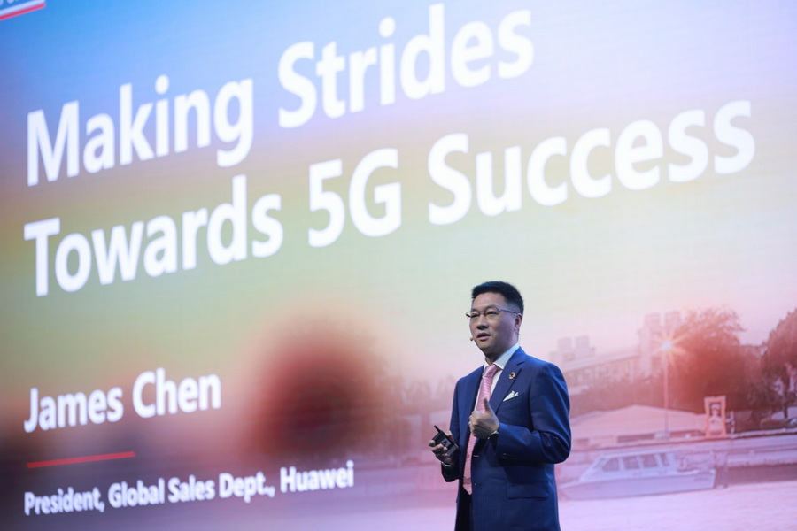 เจมส์ เฉิน ประธานฝ่ายขายกลุ่มธุรกิจผู้ให้บริการเครือข่ายของหัวเว่ย (Huawei Carrier BG) กล่าวปาฐกถาในหัวข้อ ‘ก้าวอย่างมั่นคงสู่ความสำเร็จของ 5G’ (Making Strides Towards 5G Success) ว่า “เราเห็นเทคโนโลยี 5G ก้าวหน้าอย่างรวดเร็ว เพื่อบรรลุศักยภาพสูงสุดเราต้องเร่งการติดตั้งและใช้ประโยชน์จากทุกย่านความถี่, ทุกหน่วยความถี่, และทุกวัตต์ เรามุ่งนำ 5G จากแบรนด์ชั้นนำและเทคโนโลยีชั้นนำมาพัฒนาสู่ประสบการณ์ชั้นนำและธุรกิจชั้นนำ และเราจะสร้างความสำเร็จเชิงพาณิชย์ของ 5G ให้ได้”