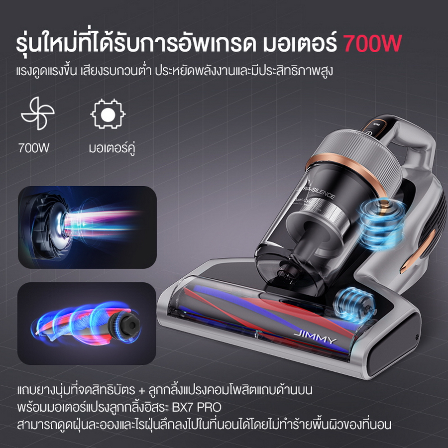 JIMMY สินค้าในเครือ KingClean Electric Co., Ltd ภายใต้สโลแกน " เทคโนโลยีสร้างคุณภาพชีวิต” (Technology Creates Quality Life) โดย JIMMY ตั้งเป้าที่จะทำให้ลูกค้าทุกท่านได้มีสุขภาพที่ดีและชีวิตที่ สะดวกสบายด้วยเครื่องกำจัดไรฝุ่น JIMMY BX7 Pro ที่มีประสิทธิภาพในการกำจัดและป้องกันไรฝุ่น เพื่อกลุ่มผู้ที่เป็นภูมิแพ้ โดย JIMMY ให้ความสำคัญกับการวิจัยและพัฒนาส่งผลให้มีสิทธิบัตรและนวัตกรรมต่างๆ ในหมวดนี้ โดยเฉพาะแถบยางนุ่มที่จดสิทธิบัตรแล้ว รวมทั้งแปรงลูกกลิ้งคอมโพสิตขนแปรงซิลิโคนพร้อมมอเตอร์แปรงลูกกลิ้งอิสระให้พลังการดูดที่แข็งแกร่งและรวดเร็ว และยังได้รับการรับรองจากมูลนิธิ AllergyUK ในด้านความชำนาญการกำจัดไรฝุ่น และการทำความสะอาดอย่างมืออาชีพ