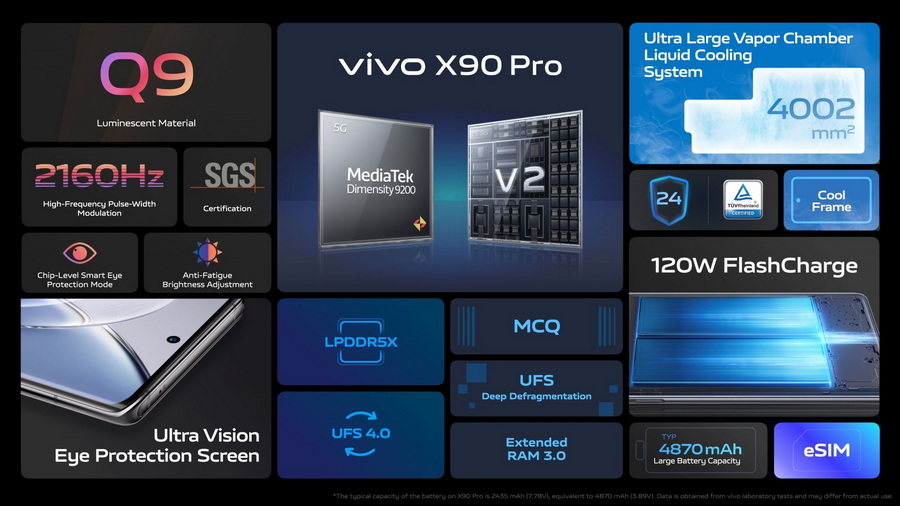 X90 Pro 5G ยังรองรับเทคโนโลยีชาร์จไว 120W แบบ Dual-Cell มาพร้อมแบตเตอรี่ความจุ 4870 mAh ช่วยร่นเวลาในการชาร์จได้เร็วทันใจ และเพิ่มพลังแบตเตอรี่ได้ในเวลาอันรวดเร็ว สามารถชาร์จได้ถึง 50% ในเวลาเพียง 8 นาที โดย X90 Pro 5G ยังรองรับเทคโนโลยีชาร์จไว 50W ไร้สายอีกด้วย โดยโหมดการชาร์จสองโหมดจะควบคุมอุณหภูมิที่เพิ่มขึ้นและความเร็วในการชาร์จ พร้อมระบบป้องกันความปลอดภัยแบบ 24 มิติ และผ่านการรับรองจาก TÜV Rheinland ซึ่งได้ทำการทดสอบการชาร์จอย่างเข้มงวด ความเร็ว และความเข้ากันได้ของอุปกรณ์ หมดกังวลในการชาร์จอีกต่อไป