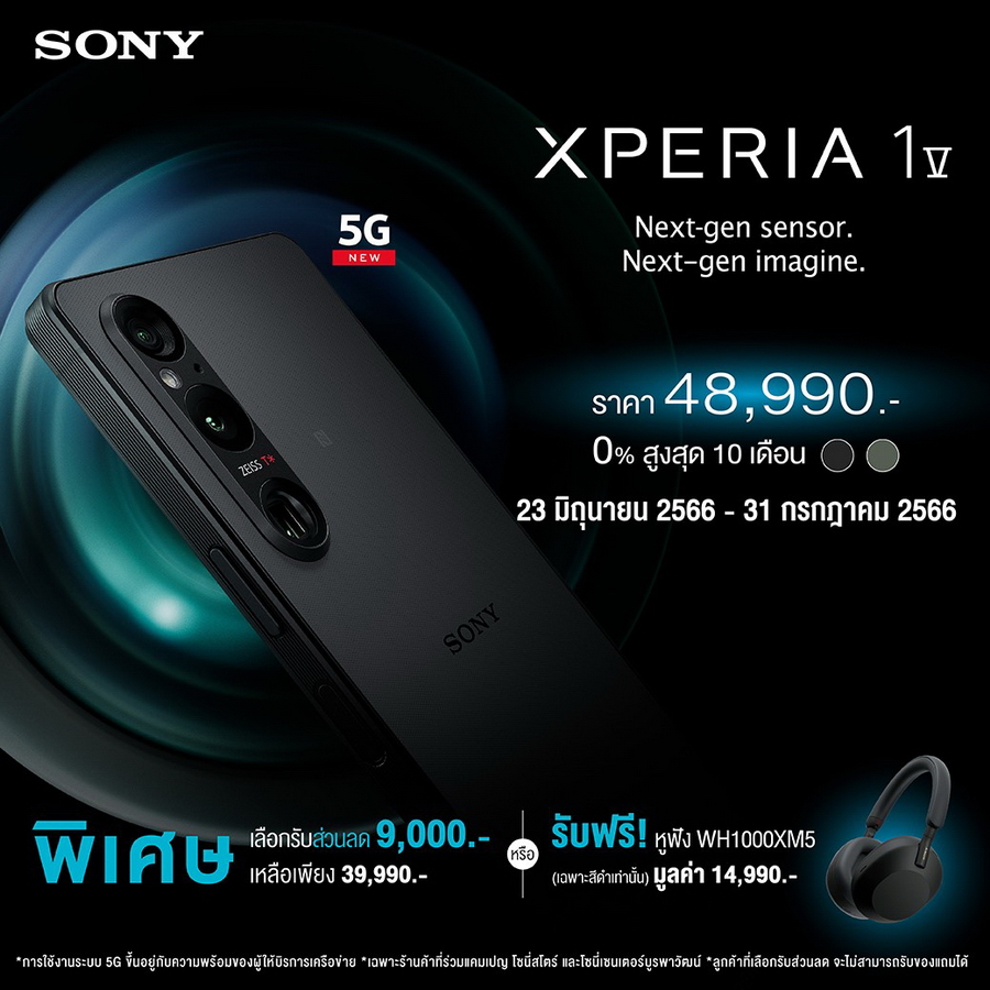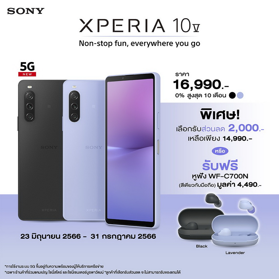 - เลือกรับฟรีหูฟัง Truly Wireless รุ่น WF-C700N (สีดำ หรือสีลาเวนเดอร์)* มูลค่า 4,490 บาท *(เมื่อซื้อสินค้าในราคาเต็ม (16,990 บาท) จะได้รับ หูฟัง WF-C700N สีเดียวกับตัวเครื่อง Xperia 10 V ที่สั่งซื้อ)