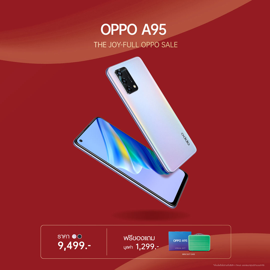 OPPO A95 สมาร์ทโฟนรุ่นใหม่ล่าสุด มาภายใต้สโลแกน “สมาร์ทไปให้สุดฟอร์ม” เอาใจสายเอนเตอร์เทรนเมนต์ ครอบคลุมทุกไลฟ์สไตล์ โดดเด่นด้วยดีไซน์บางเบาสุดสมาร์ท พร้อมฝาหลังที่สร้างด้วยเทคนิค OPPO Glow Design รุ่นแรกใน OPPO A Series มอบฝาหลังแบบด้านที่มีประกายระยิบระยับสวยงาม นอกจากนี้ ยังมอบความเร็วแรงที่มากกว่าด้วย RAM 8GB, ROM 128GB และ RAM Expansion ที่สามารถเพิ่มได้ถึง 5GB พร้อมชาร์จไว 33W Flash Charge และแบตเตอรี่ขนาดใหญ่จุใจ 5,000 mAh มอบความสนุกแบบไม่มีสะดุด รวมถึงมีดีไซน์บางเบา สวยโดดเด่น พร้อมด้วยหน้าจอ AMOLED FHD+ punch-hole display ขนาด 6.43 นิ้ว และฟีเจอร์ All-Day Eye Care ถนอมสายตา โดยเมื่อซื้อ OPPO A95 ในราคา 9,499 บาท รับฟรีทันที! กระเป๋า Mini suit case มูลค่า 1,299 บาท