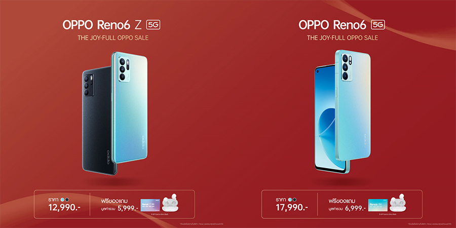 สำหรับ OPPO Reno6 5G สมาร์ทโฟนสำหรับการถ่ายพอร์ตเทรต โดดเด่นด้วยดีไซน์กรอบแบนเรียบสไตล์ Retro พร้อมการันตีความฮอตฮิตติดตลาดกวาดยอดขายอันดับ 1 ของสมาร์ทโฟนในช่วงราคา 15,000 – 20,000 บาท ภายใน 3 วันแรกที่วางจำหน่าย โดยเมื่อซื้อ OPPO Reno6 5G ในราคา 17,990 บาท รับทันที! E-VIP Card ประกันหน้าจอแตก 1 ปี และ OPPO Enco Buds หูฟังไร้สายอัจฉริยะ รวมมูลค่าถึง 6,999 บาท