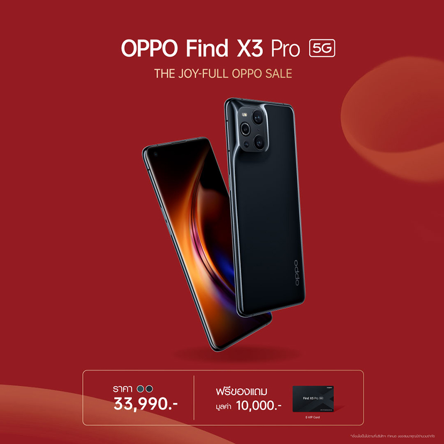 สมาร์ทโฟนแฟล็กชิพ OPPO Find X3 Pro 5G ที่สุดแห่งพันล้านสี มาพร้อมกล้องหลักคู่ 50MP และ เซ็นเซอร์ Sony IMX766 ถึงสองตัวครั้งแรกของโลก รวมถึงเทคโนโลยี 10-bit Full-path Colour Engine ระบบการประมวลสีตั้งแต่การถ่ายภาพไปจนถึงการแสดงผล ให้ผู้ใช้งานสามารถสัมผัสประสบการณ์สีที่นุ่มนวลและสมจริงได้มากถึงหนึ่งพันล้านสี โดยเมื่อซื้อ OPPO Find X3 Pro 5G รับทันที! E-VIP Card ประกันหน้าจอแตก 1 ปี มูลค่าถึง 10,000 บาท