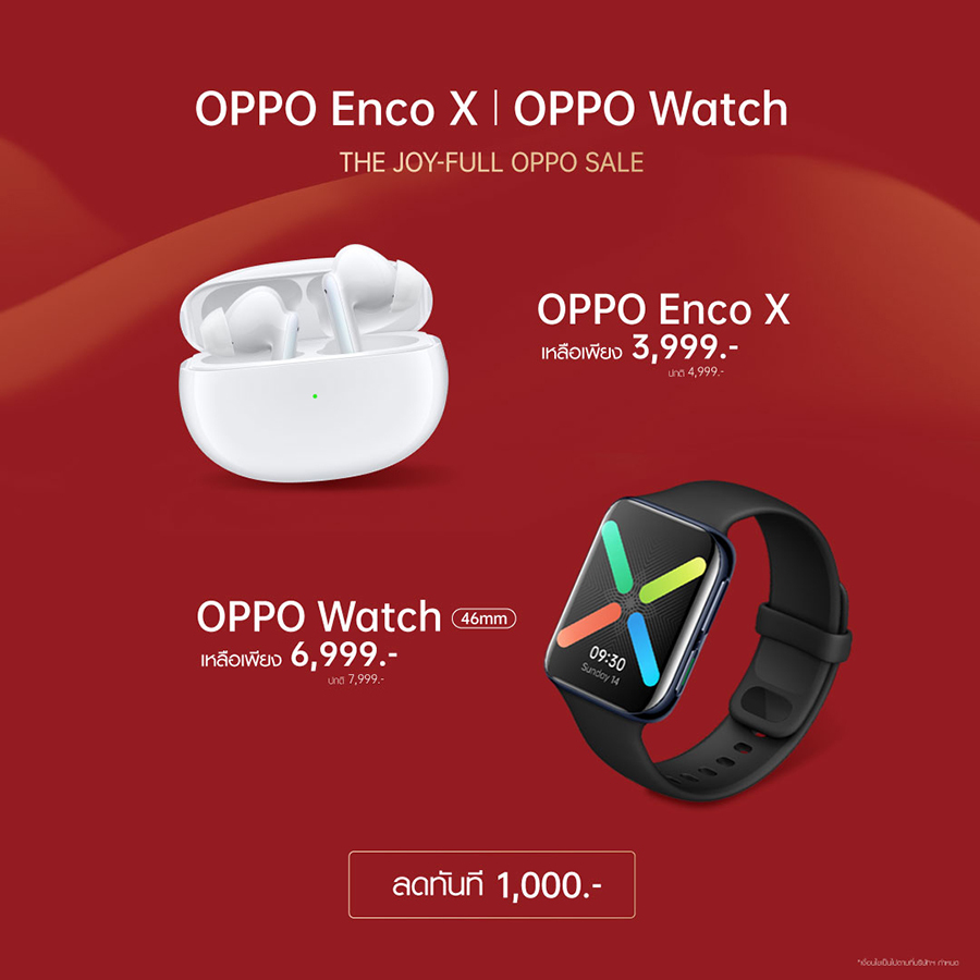 OPPO ให้คุณเป็นเจ้าของหูฟังไร้สายอัจฉริยะและสมาร์ทวอร์ซในราคาที่สุดคุ้ม ด้วยส่วนลดทันที! 1,000 บาท โดยเมื่อซื้อ OPPO Enco X หูฟังไร้สายที่สร้างสรรค์ร่วมกันกับ Dynaudio พิเศษ 3,999 บาท จากปกติ 4,999 บาท