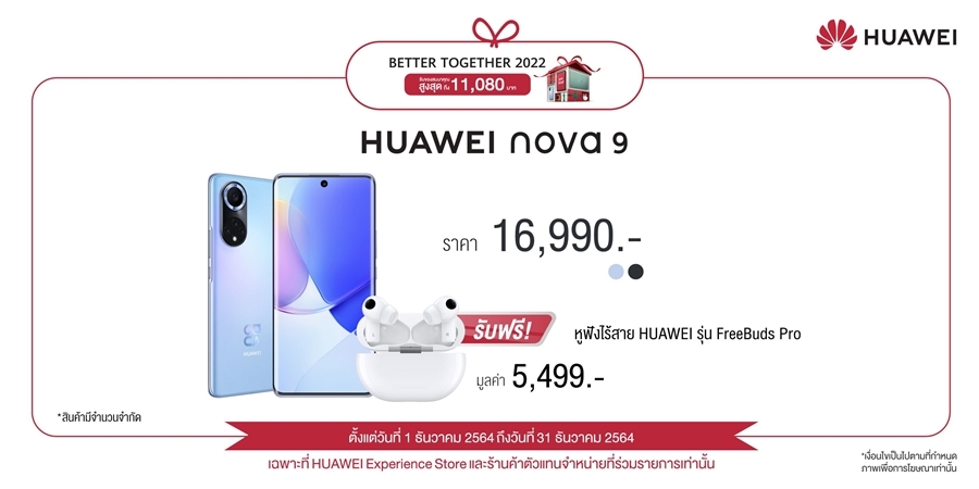 HUAWEI nova 9 สมาร์ทโฟนกล้องโปรระดับเรือธงรุ่นล่าสุดขวัญใจนักสร้างสรรค์ อัดแน่นด้วยเทคโนโลยีการถ่ายภาพอย่างกล้อง Super Sensing 50MP Ultra Vision AI Quad Camera จอ 120 Hz และรองรับการชาร์จไว 66W HUAWEI SuperCharge ราคา 16,990 บาท เมื่อซื้อรับหูฟัง HUAWEI FreeBuds Pro มูลค่า 5,499 บาทไปใช้คู่กันเก๋ๆ ได้เลย