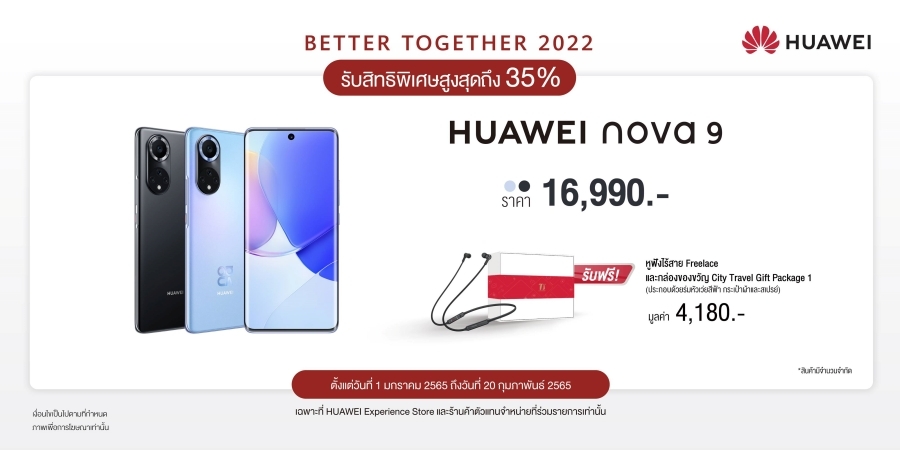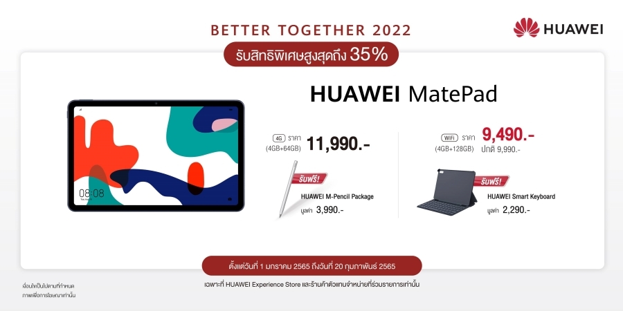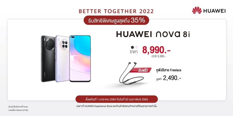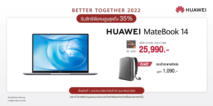 หัวเว่ย คอนซูมเมอร์ บิสสิเนส กรุ๊ป (ประเทศไทย) ส่งความสุขต้อนรับปีเสือให้ลูกค้าได้จุใจแบบไม่อั้น จัดแคมเปญ BETTER TOGETHER 2022 มอบข้อเสนอพิเศษมากมายเพื่อการใช้ชีวิตแบบอัจฉริยะ ตอบโจทย์ได้อย่างครบเครื่องทั้งเรื่องงานและการดูแลรักษาสุขภาพแบบล้ำๆ ในยุคดิจิทัล กับส่วนลดสูงสุดถึง 35% พร้อมของสมนาคุณแบบจัดเต็มสำหรับสินค้าไอทีมากมายจากหลากหลายกลุ่มผลิตภัณฑ์ ใครที่อยากเริ่มต้นปีแบบมีชัยไปแล้วกว่าครึ่ง บอกเลยว่าห้ามพลาดเพราะข้อเสนอดีๆ แบบนี้มีระยะเวลาจำกัด เฉพาะวันที่ 1 มกราคม 2565 ถึง 20 กุมภาพันธ์ 2565 เมื่อซื้อสินค้าที่ HUAWEI Experience Store และ ร้านค้าตัวแทนจำหน่ายที่ร่วมรายการเท่านั้น