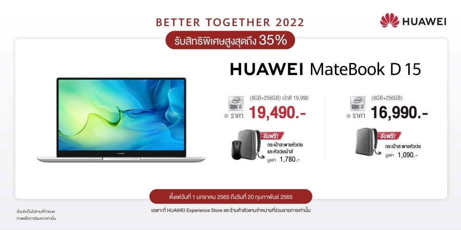 - HUAWEI MateBook D 15 (i5) 8GB+256GB ราคาพิเศษ 19,490 บาท จากราคาปกติ 19,990 บาท พร้อมรับฟรี กระเป๋าสะพายหัวเว่ยและหัวเว่ยเมาส์ รวมมูลค่า 1,780 บาท